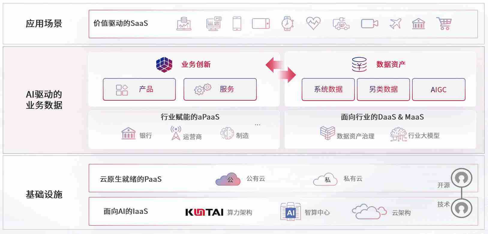 数字时代,,,围绕企业数字化转型的关键要素,,,j9国际站备用数码开创性的提出数云融合战略和技术体系框架,,着力在云原生、、数字原生、、AI原生和信创产业上架构产品和服务能力,,,为处在不同数字化转型阶段的快消零售、、、汽车、、、金融、、、医疗、、、、政企、、教育、、、、运营商等行业客户提供泛在的敏捷IT能力和融合的数据驱动能力,,,构建跨界融合创新的数字业务场景和新业务模式,,,助力企业级客户建立面向未来的核心能力和竞争优势,,,全面推动社会的数字化、、、智能化转型升级。。