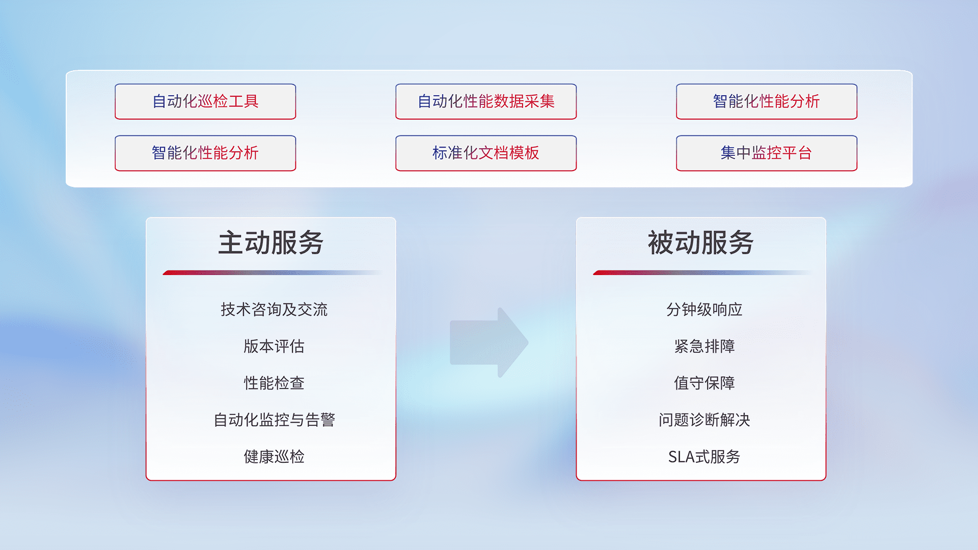 智能化工具和标准化文档,,,,保障服务质量,,,,提供主动服务(包含技术咨询、、版本评估、、性能检查、、自动化监控与告警、、健康巡检)和被动服务包含(分钟级响应、、、、紧急排障、、、、值守保障、、、问题诊断解决、、SLA服务)。。。。